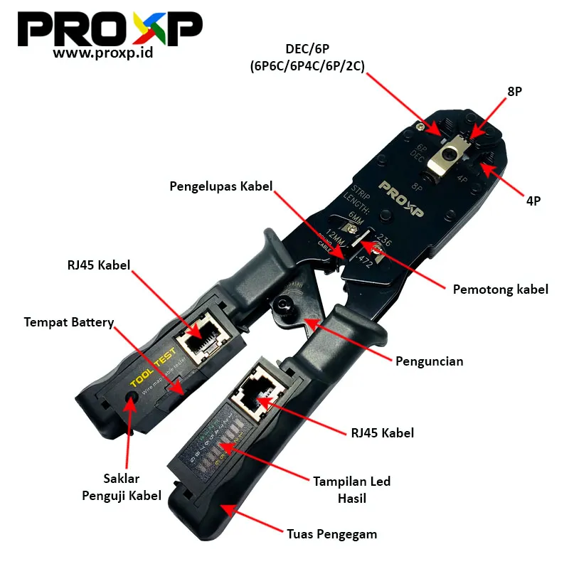 CRIMPING TOOL WITH CABLE TESTER WITH ROUND CABLE STRIPPER Bisa di gunakan untuk konektor RJ45 CAT 5 maupun CAT 6. Memotong sekaligus crimp pada waktu yg bersamaan. Efesien dan menghasilkan hasil crimping yang